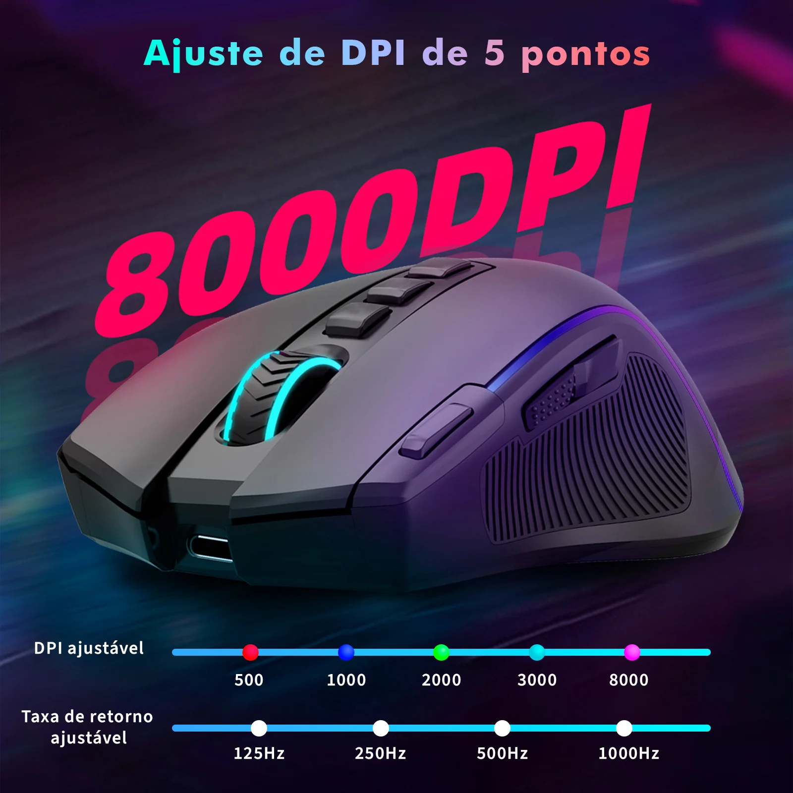 Tri-Mode 8000DPI Mouse Gamer Bluetooth/2.4G/Cable, 9 Botões Programáveis, 1000mAh and RGB Battery for PC/Notebook, Coibeu